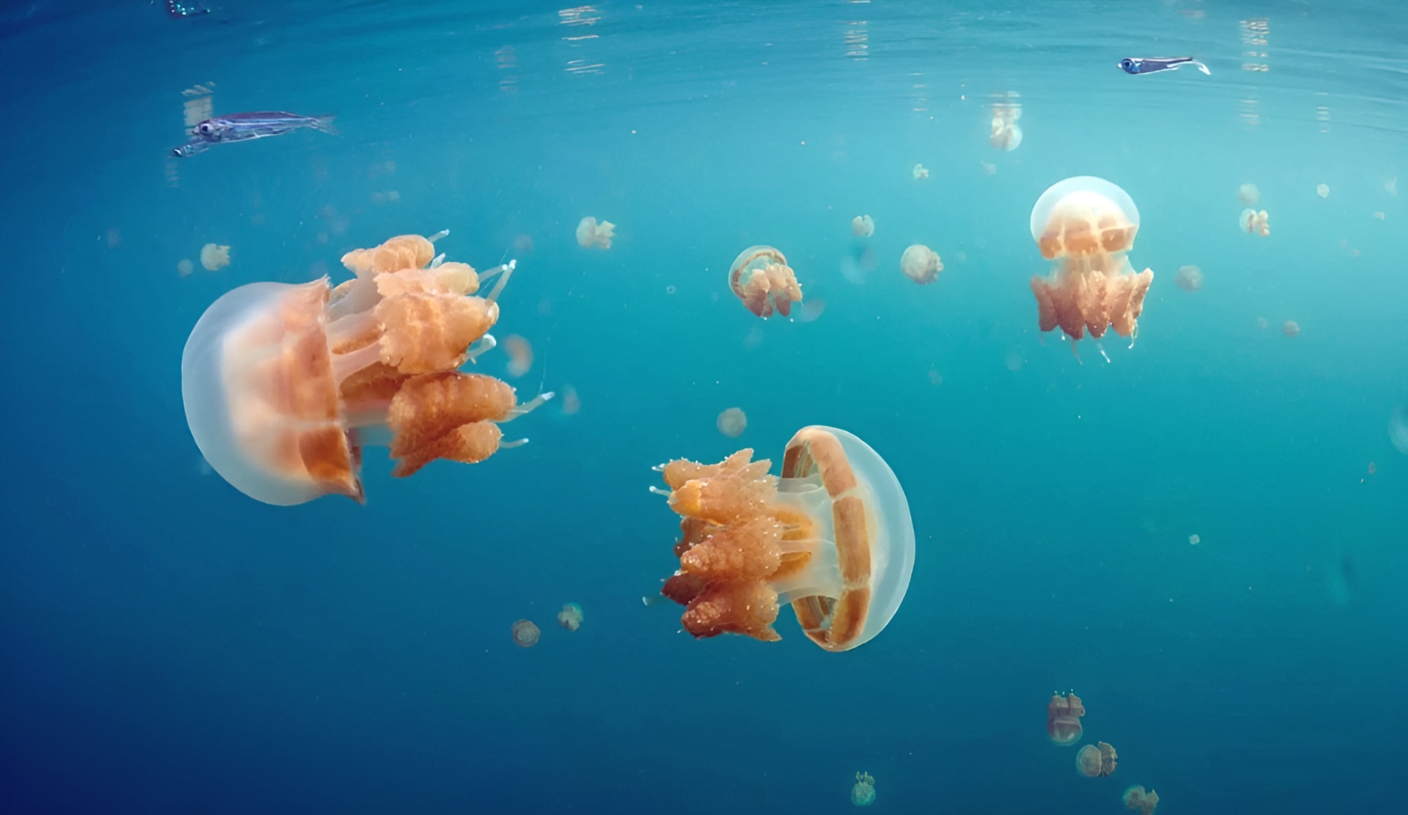 In geschutzten Meeresseen konnen Mastigias-Quallen haufig und fur Schwimmer harmlos sein.
